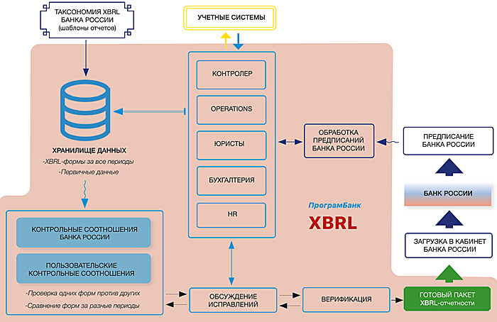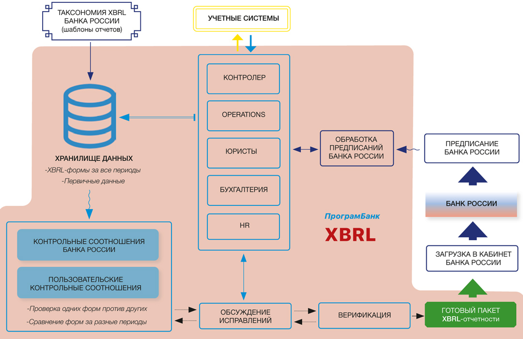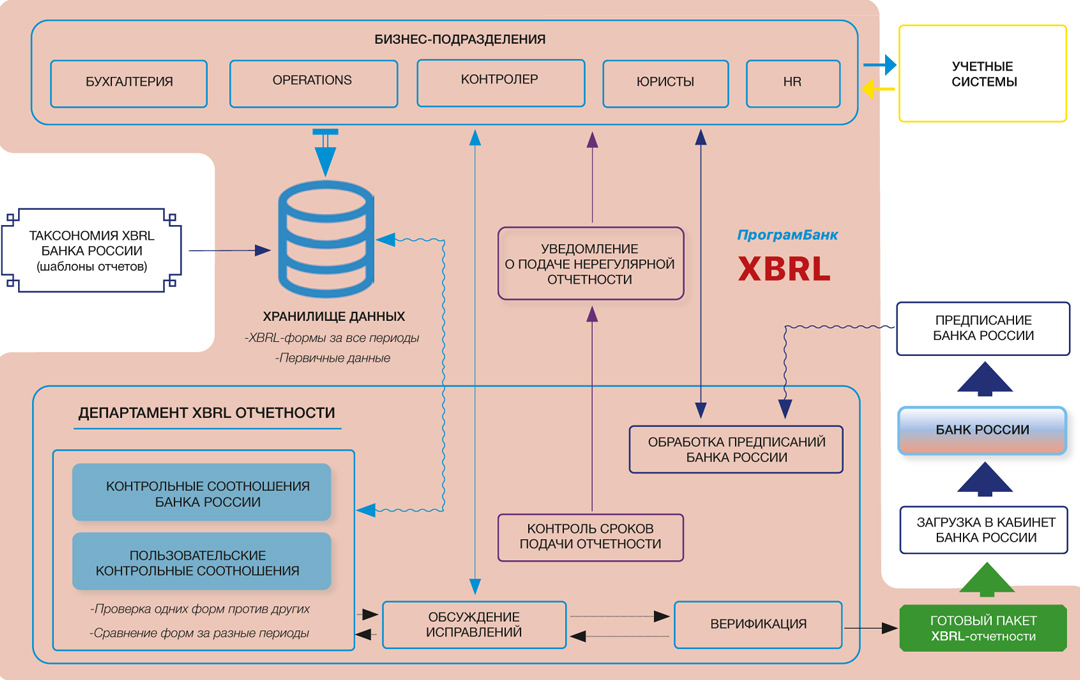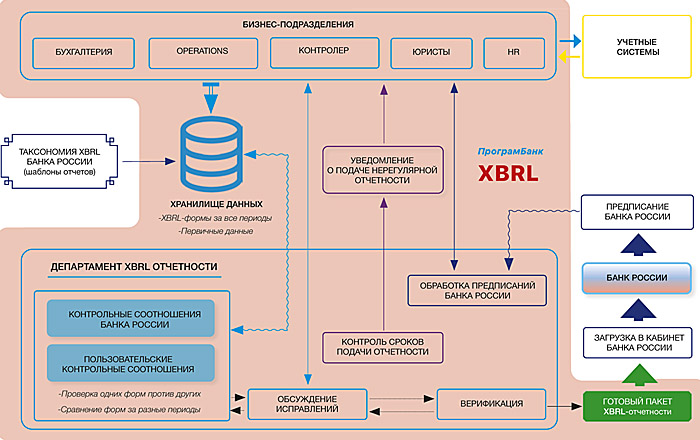 В этом идеальном случае, формирование отчетности в компании соответствует следующей схеме (на примере использования специализированной системы «ПрограмБанк.XBRL»):