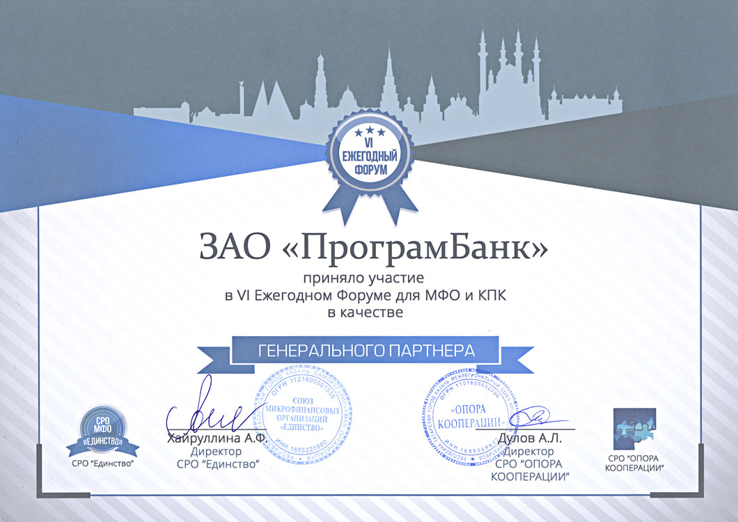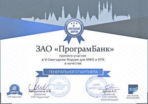 27 октября 2017 года компания «ПрограмБанк» выступила Генеральным спонсором VI Ежегодного Форума микрофинансовых организаций и кредитных потребительских кооперативов. Организаторы Форума — Саморегулируемая организация Союз микрофинансовых организаций «Единство» и межрегиональный союз кредитных кооператоров «Опора кооперации».