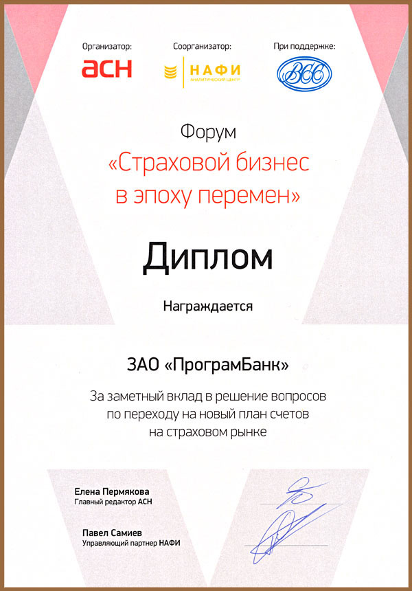 Оргкомитет Форума «Страховой бизнес в эпоху перемен» отметил особый вклад компании «ПрограмБанк» в решение вопросов по переходу на новый план счетов на страховом рынке. Справочная информация |