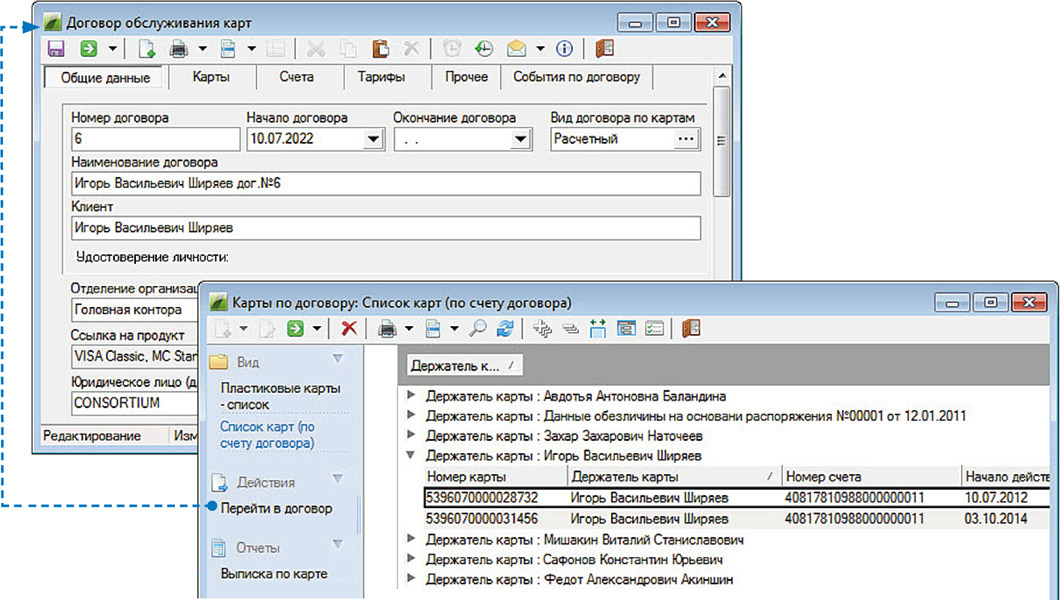 - Ведение договоров обслуживания пластиковых карт, учет всех операций по договору (выпуск, перевыпуск, дополнительные карты, блокировки, лимиты и др.). Возможность привязки нескольких карт к одному СКС. Начисление процентов в соответствии с настройками договора. Пополнение счета карты.
