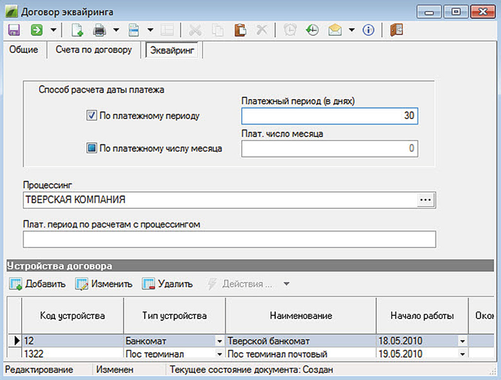- Эквайринг: ведение договоров по обслуживанию торгово-сервисных предприятий, учет и регистрация внешних устройств (POS-терминалы, терминалы самообслуживания, виртуальные POS-терминалы), прием транзакций по картам и устройствам.
