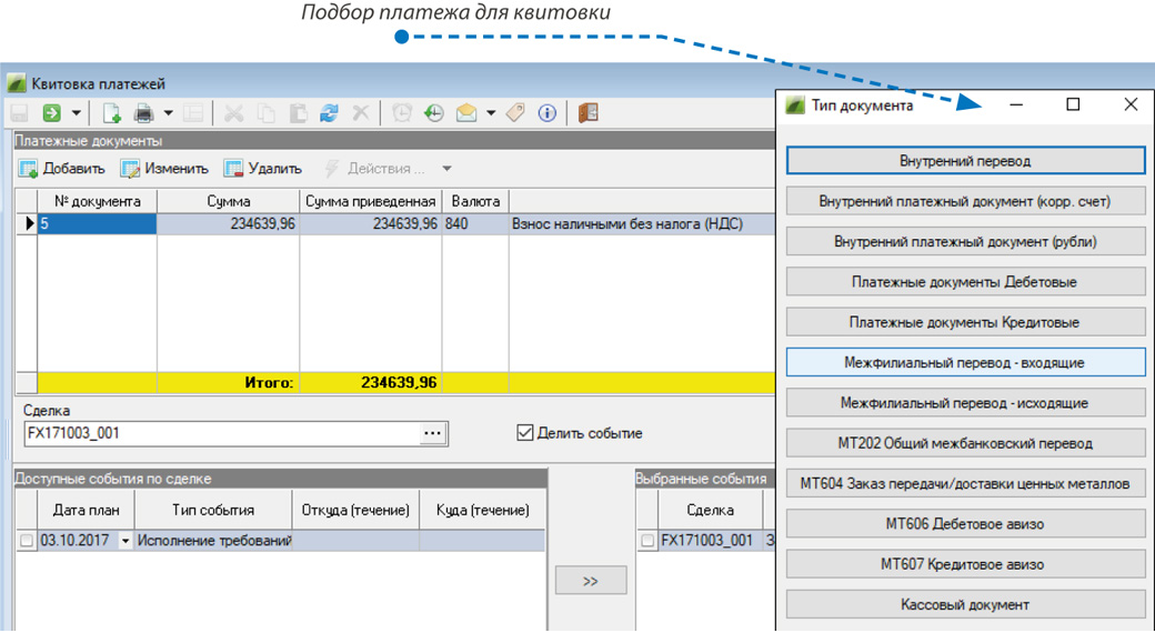 - Квитовку платежей по сделкам.