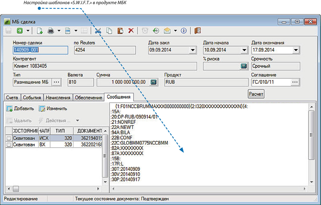 - Квитовка платежей по сделкам. Формирование и обработка подтверждений по сделкам в формате SWIFT: MT320, MT202.