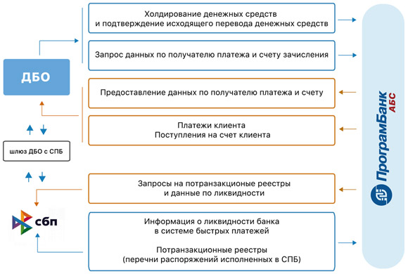 В решении «ПрограмБанк.АБС» реализовано трехстороннее взаимодействие следующих информационных систем: СБП, используемой банком АБС и системы «Клиент-банк». Решение разработано совместно с компанией «БИФИТ».