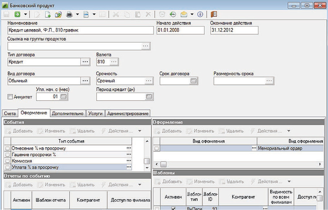 - При настройке кредитного продукта описываются события, которые влияют как на тарификацию, так и на бухгалтерское оформление.