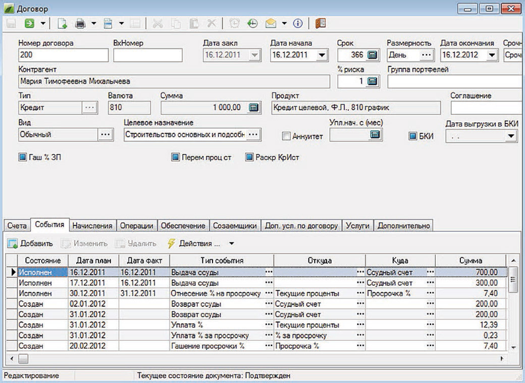 - Оформление кредита в соответствии с выбранным продуктом, параметрами договора и индивидуальными коррективами специалиста банка, автоматическое открытие счетов (в соответствии с настроенными масками), создание плана всех событий по договору, как показано выше.