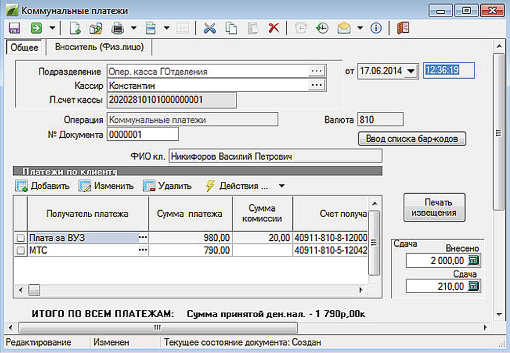 • Оплата коммунальных платежей (с возможностью считывать и обрабатывать бар-код).