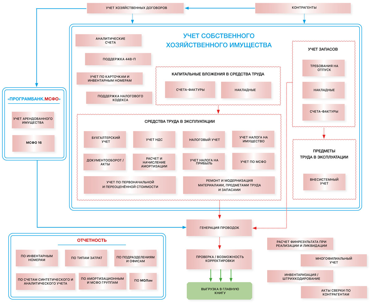 В рамках банковской ИТ-системы «ПрограмБанк.АБС» реализован широкий ряд возможностей по учету и контролю материальных активов, договоров и расходов банка. В рамках модуля «Учет материальных ресурсов» реализован учет основных средств, капитальных вложений, малоценного имущества и материалов (складской учет).