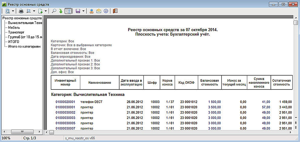 Для того, чтобы совместить задачи регламентированного и оперативного учета, предусмотрен учет как по регламентированным категориям (МОЛ, подразделение, ОКОФ, шифры, налоговые, амортизационные группы, нормы амортизации, группы МСФО и т.д.), так и справочникам, служащим для оперативного учета (местонахождение, финансово-стоимостной анализ, дополнительные признаки и т.д.).