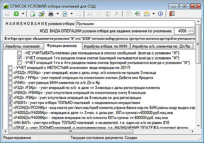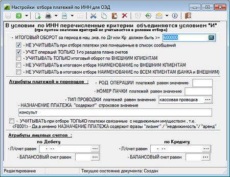 - Отбор платежей и переводов по сочетанию различных условий (превышения заданной суммы, отсутствия операций более 6 месяцев, выбор платежей связанных с лизингом, арендой, займами, драгоценными металлами, операций с недвижимостью, операций, где лицевые счета дебета