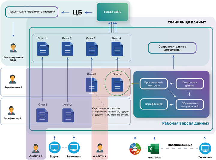 При этом аналитик отвечает за группы показателей, которые могут относиться к разным отчетам и их частям, а верификатор отвечает за отчет в целом. Поэтому при подготовке данных аналитик может взаимодействовать с разными верификаторами, а верификатор с разными аналитиками, как это видно на приведенной схеме. По итогам совместной работы аналитиков и верификаторов, ответственность за формирование финального XBRL-пакета передается лицу, которое отвечает за отправку его в ЦБ, подготовку сопроводительной документации и получение обратной связи.