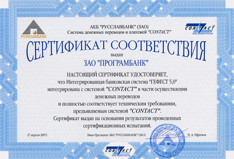| 27 апреля 2007 года компания «ПрограмБанк» в торжественной обстановке стала обладателем «СЕРТИФИКАТА СООТВЕТСТВИЯ» требованиям Системы Международных денежных переводов и платежей «CONTACT». Вручение сертификата прошло в рамках юбилейной 5-ой Международной конференции Системы «CONTACT» «Денежные переводы: тенденции и перспективы», которая прошла в московской Галерее искусств Зураба Церетели. В работе конференции приняли участие представители Правительства РФ, Совета Федерации и Государственной Думы, Банка России, Ассоциации Российских банков и Ассоциации региональных банков «Россия», а также более 300 представителей коммерческих банков и журналисты ведущих печатных изданий. |