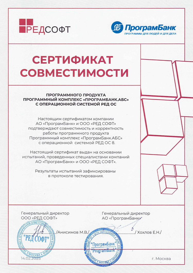 14 февраля 2025 года компания «ПрограмБанк» получила Сертификат совместимости Программного комплекса «ПрограмБанк.АБС» с Операционной системой РЕД ОС. | ![]() |