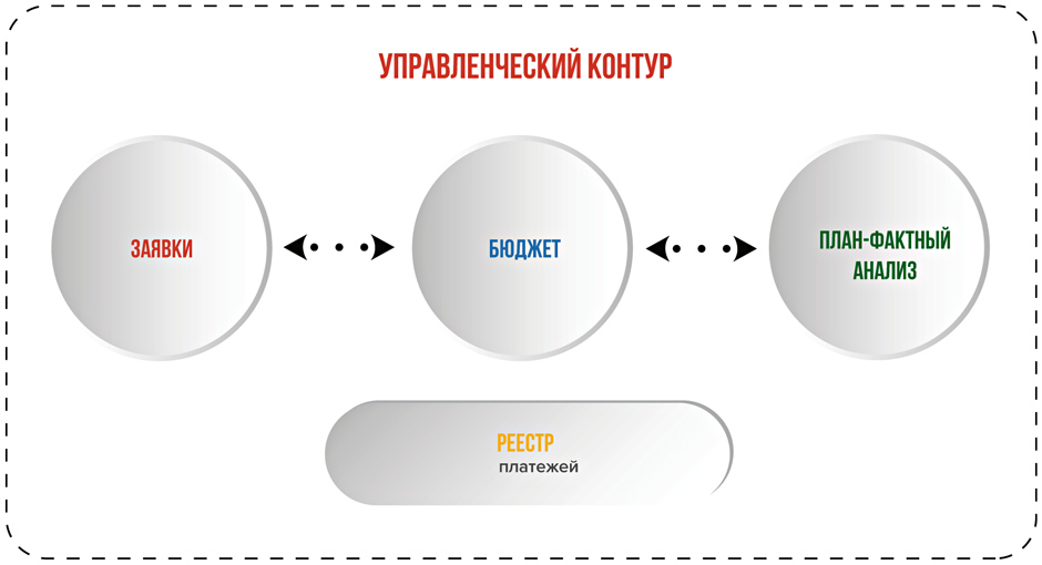 Предлагаемый сквозной бизнес-процесс управления расходами включает в себя два контура: управленческий, а также оперативный и бухгалтерский. В первом - формируется бюджет, инициируются и согласуются расходы, проводится план-фактный анализ, во втором – выполняются фактические расчеты с поставщиками, ведется учет материальных средств. Оба контура между собой бесшовно интегрированы, обмен информацией проводится по расписанию планировщиком заданий.