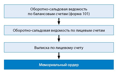 Например, для отчета "Оборотно-сальдовая ведомость (форма 101)" путь "погружения" от остатков и оборотов по балансовым счетам до мемордеров будет следующим: остатки по балансовому счету расшифровываются до «сальдовки по лицевым» одним щелчком мыши, как и остаток по лицевому – до выписки по нему.