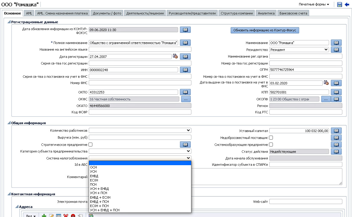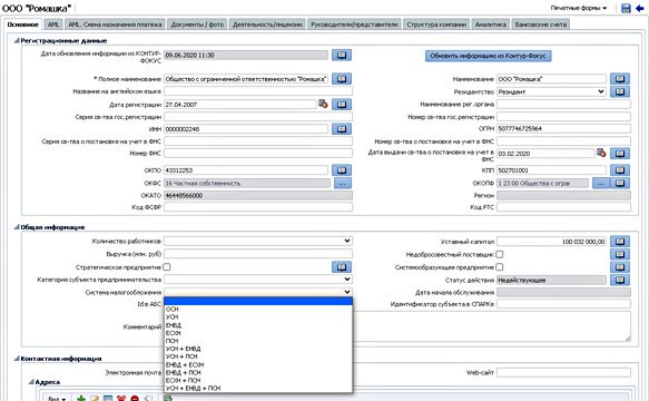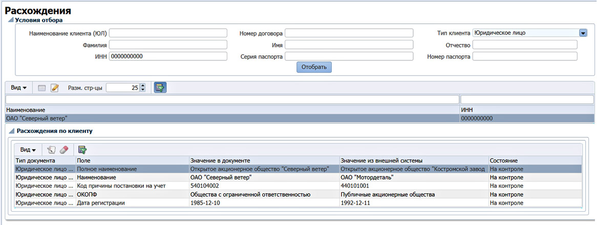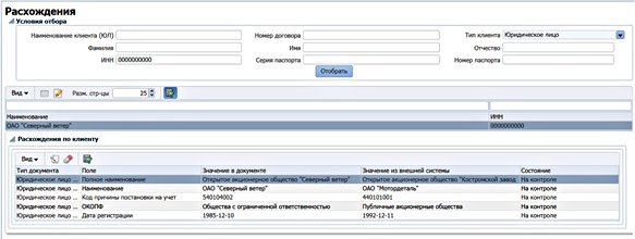 - Автоматическая или ручная корректировка карточки клиента на основе выявленных расхождений и принятие решения специалистом. В модуле настраивается, по каким реквизитам клиента осуществляется контроль (список реквизитов настраивается отдельно для юридических лиц и индивидуальных предпринимателей).