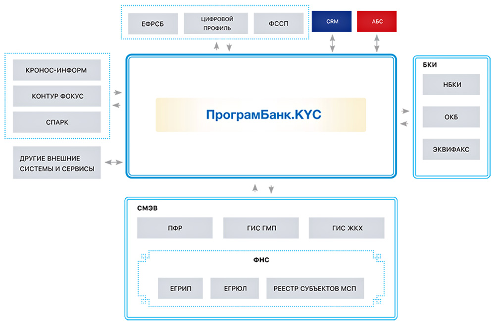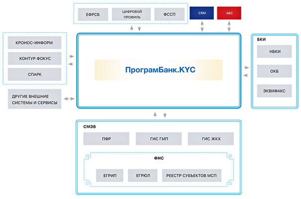 Модуль «ПрограмБанк.KYC» позволяет собирать информацию из внешних источников не только о клиентах, но об их контрагентах. «ПрограмБанк.KYC» (Знай своего клиента) позволяет настраивать методики анализа контрагентов клиентов банка. При этом анализируются и учитываются взаимосвязи клиентов с различными контрагентами (включая платежи между ними, проходящие через банк).