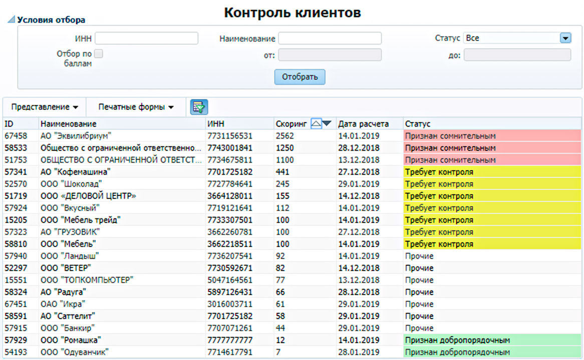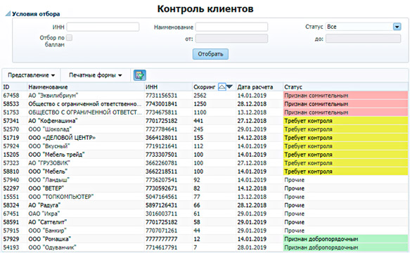 - Ранжирование клиентов по выбранным клиентам (например, по уровню риска ПОД/ФТ).